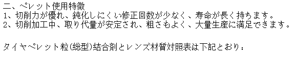 レンズタイプ | 耐摩耗度範(fàn)囲 | 代表硝材 | 金屬結(jié)合剤 | 樹脂結(jié)合剤 | 大徑 | 小徑 | 大徑 | 小徑 | A | 80以下 | S-LAH66,S-LAH55, S-LAH58,S-LAH60, S-LAH64,TAFD5, TAFD30,LAC8,TAC8 | ZM24 ZM366 | ZM24 ZM30 ZM20 | ZR2 | ZR2、ZR3 | B | 80-150 | BSC7,BAC4,BACD, E-F,S-BSL7,S-BSM, S-BAL,S-BAH,S-TIM | ZM24 ZM366 ZM26 | ZM24 ZM30 ZM20 | ZR2、ZR3 | ZR2、ZR3 ZR7、ZR707 | C | 150-260 | S-TIH,S-LAM, E-FD1,FD60,FD110, E-FDS1,FDS90 | ZM26 ZM24 ZM21 ZM22 | ZM24 ZM10 ZM26 ZM20 | ZR3、ZR707 | ZR7 ZR707 | D | 260以上 | FCD1,PCD4, S-FPL,S-PHM | ZM21 ZM22 | ZR7K1000# | ZR707 | ZR707 ZR465 | G | 平面用ペレット | | | ZR717K1000# | H | 皿修正用ペレット | ZM23Q1000# ZM51Q1000# | |