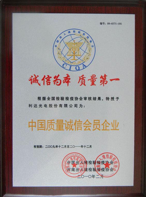 利達(dá)光電股份有限公司榮獲首批“中國質(zhì)量誠信會員企業(yè)”榮譽稱號