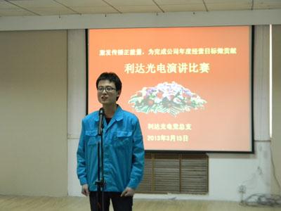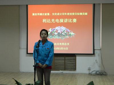 ??????? 為深入學(xué)習(xí)貫徹利達(dá)公司2013年經(jīng)營工作會議精神,進(jìn)一步明確發(fā)展目標(biāo),統(tǒng)一全員思想,激發(fā)傳播正能量,推動公司自我變革活動,在春暖花開、充滿希望的季節(jié),利達(dá)光電黨總支舉辦“激發(fā)傳播正能量,為完成公司2013年經(jīng)營目標(biāo)做貢獻(xiàn)”演講比賽活動。